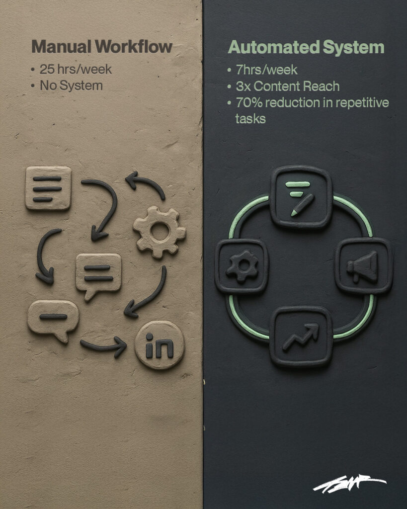 • System: We codify a weekly workflow (capture → AI draft → edit → publish → repurpose).